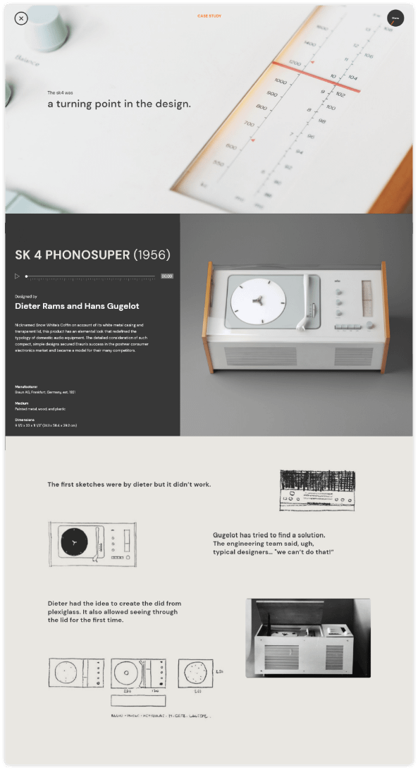 Using a web platform, I designed an interactive exhibit about Dieter Rams' appliance designs and his timeless philosophy for inspiring designers.